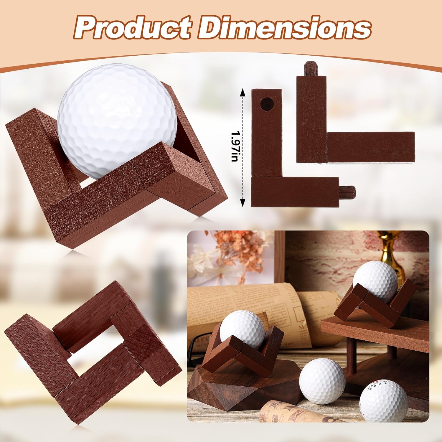 - Wooden Construction: the ball stand is crafted out of wooden material, presenting a walnut color; The aesthetics of the walnut wood color grain add a delicate charm to the holder, ensuring it fits seamlessly into any home decor setup