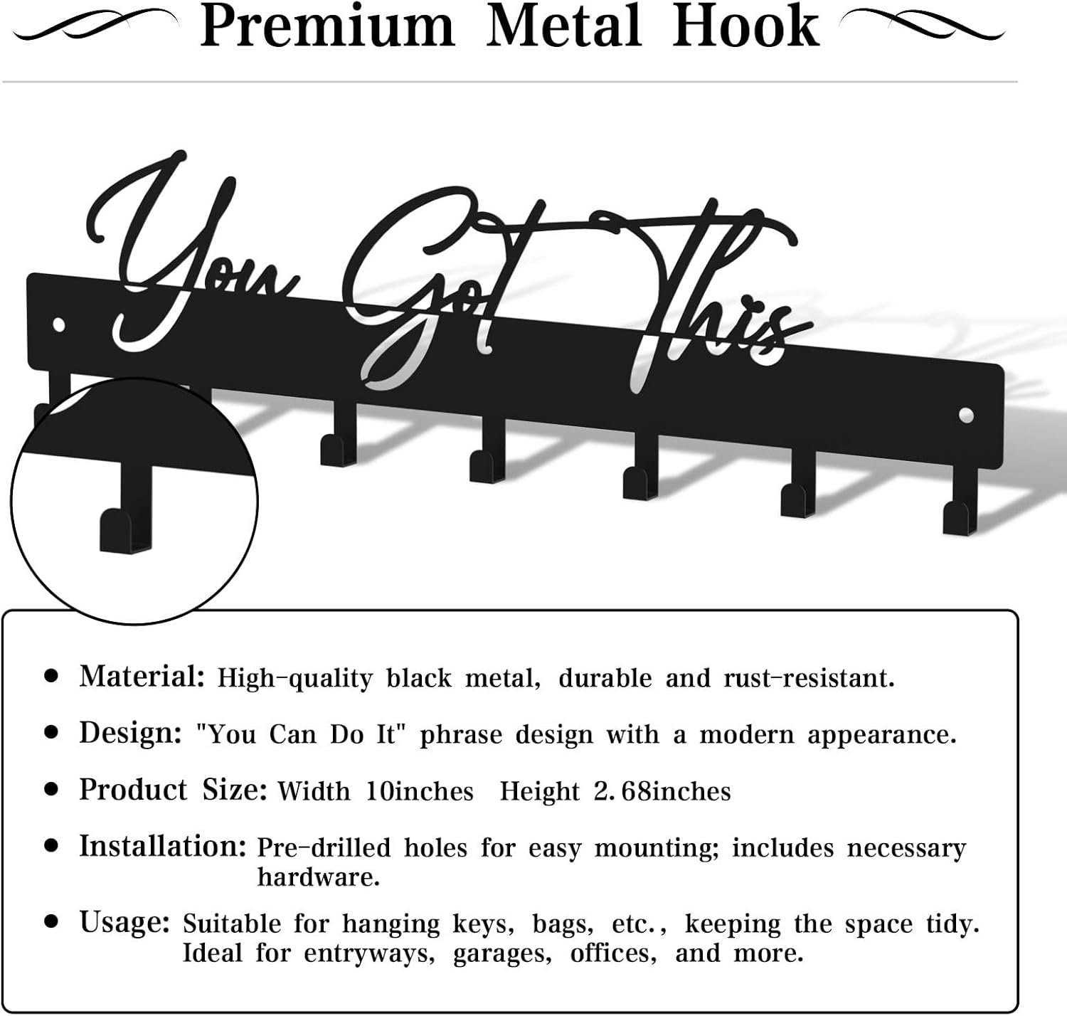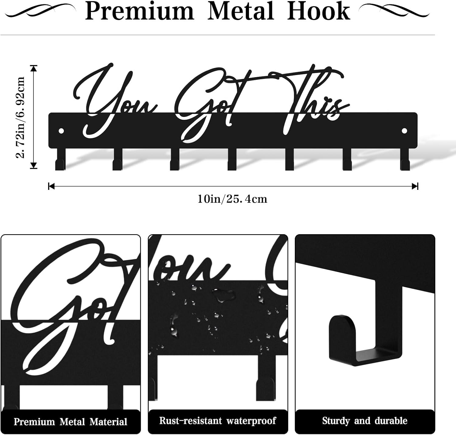 10 Inch Key Holder for Wall, Black Metal House Decoration Key Hooks, Phrase Style(You got This), Key Hanger Organizer with 7 Hooks, Suitable for Doors, Corridors, Living Rooms, Bedrooms