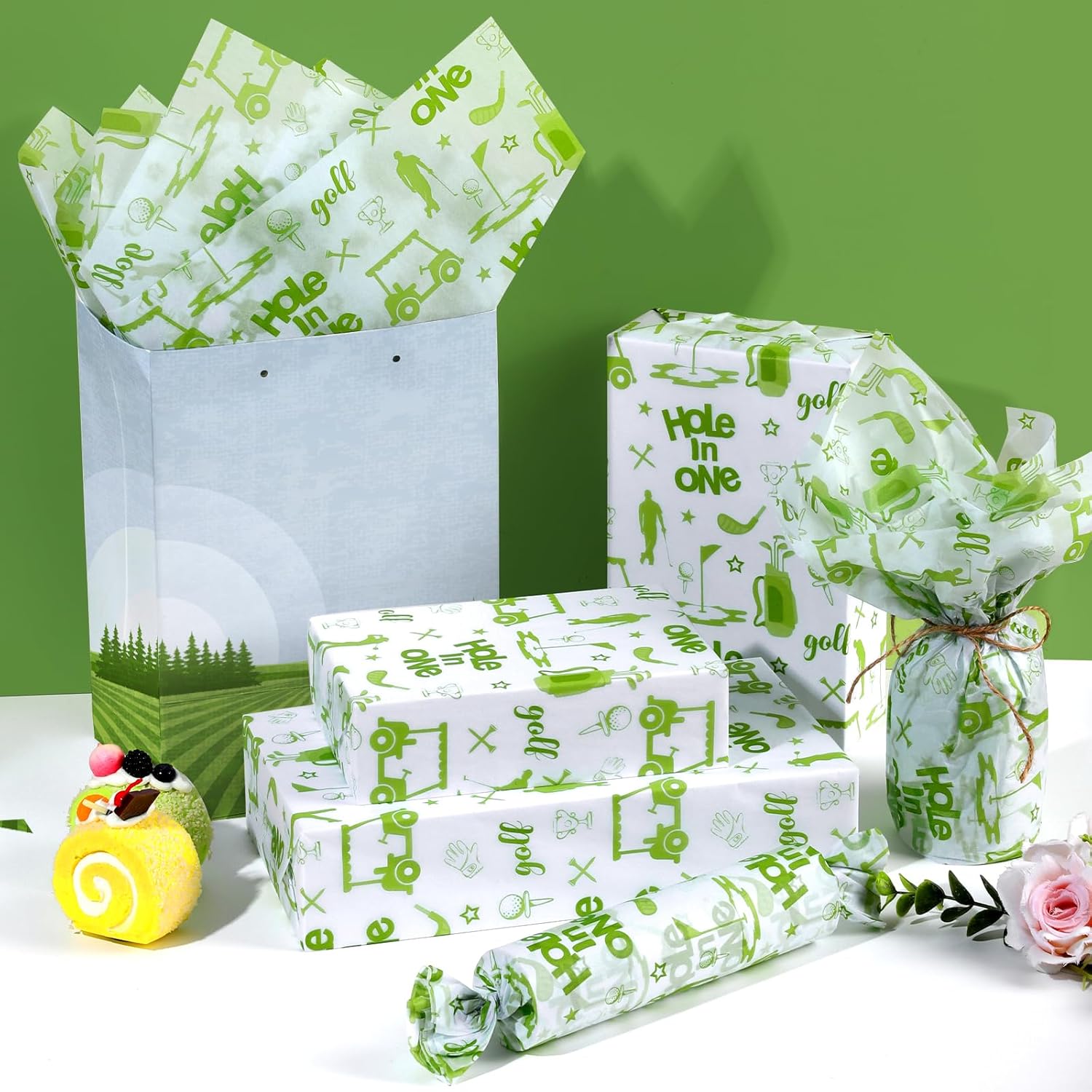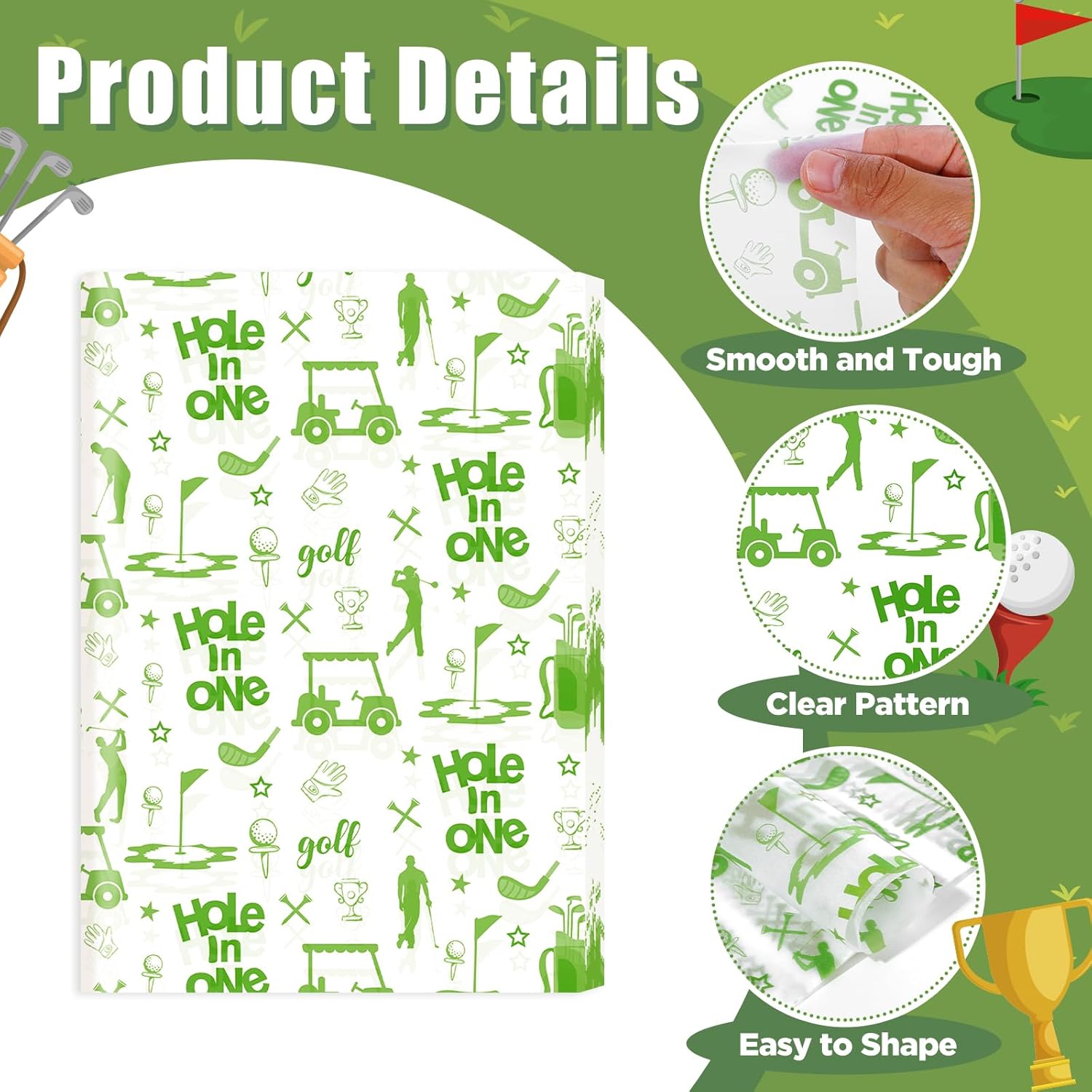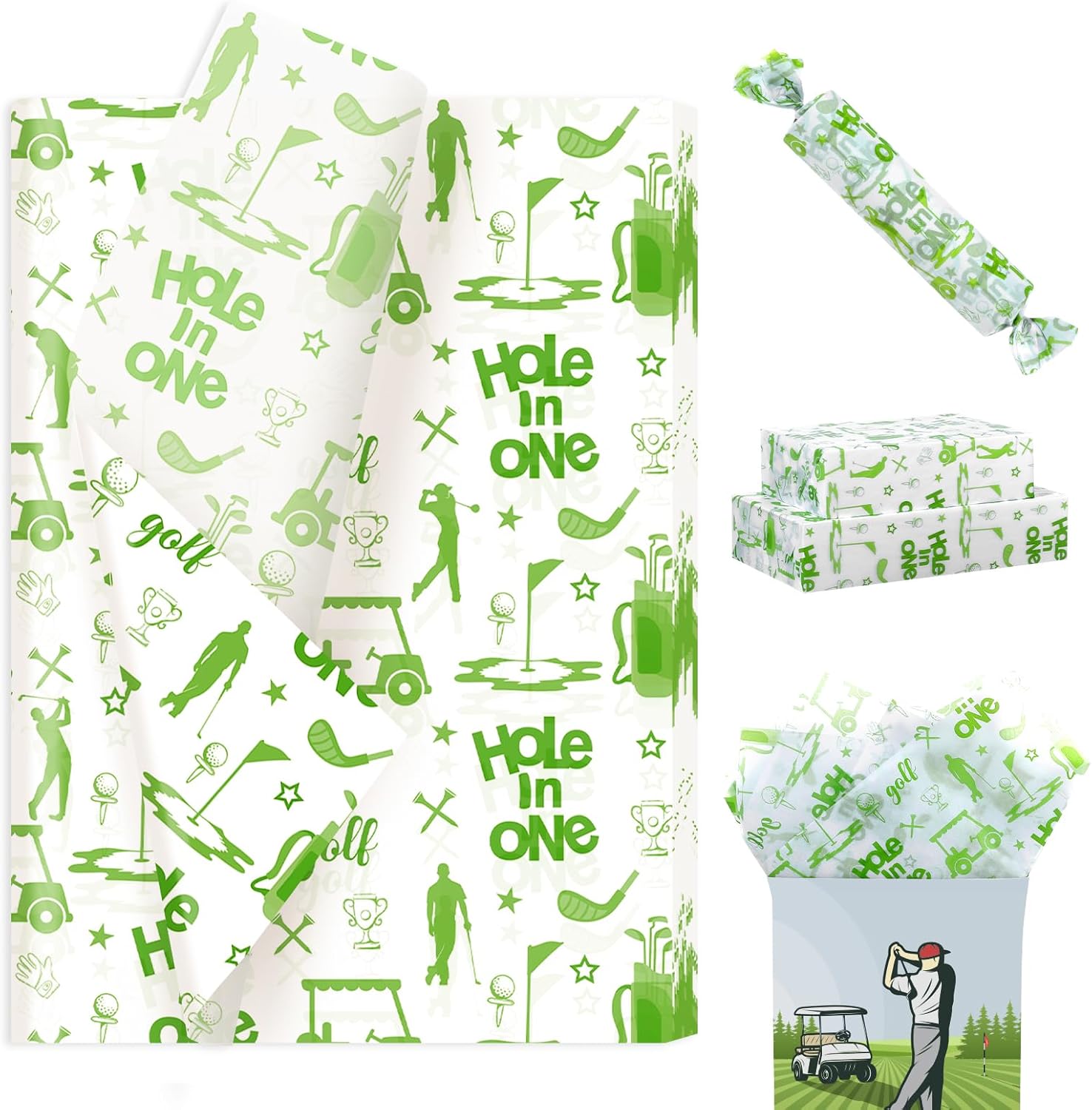 - [Premium Material] Our Hole in One birthday wrapping tissue papers are crafted from high quality paper materials. Featherlight, soft and comfortable to touch. Strong, not easy to tear. Its durable yet lightweight texture ensures your gifts look stunning and stay protected. Easy to fold and cut. The prints are distinct and clear, colors vivid, will not lose color. maintain their beauty. Flat-pack design eliminates bulk compared to rolled papers.