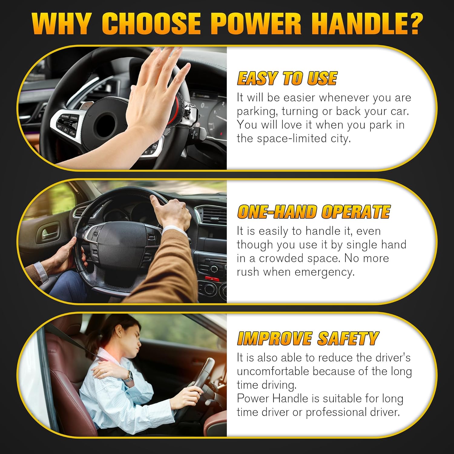 - Effortless Steering, Less Fatigue: Makes turning the wheel much easier and smoother, especially useful for elderly drivers, long distance travelers, or anyone with shoulder or arm issues. Helps reduce driving fatigue in tight spaces and during parking